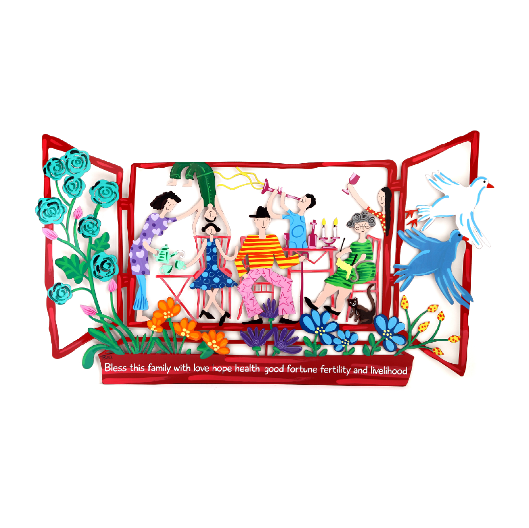 This artwork offers a fleeting glimpse through an open window into a joyful Friday night dinner. At the heart of the scene is a vibrant family gathering – eating, singing, toasting, chatting, and embracing.