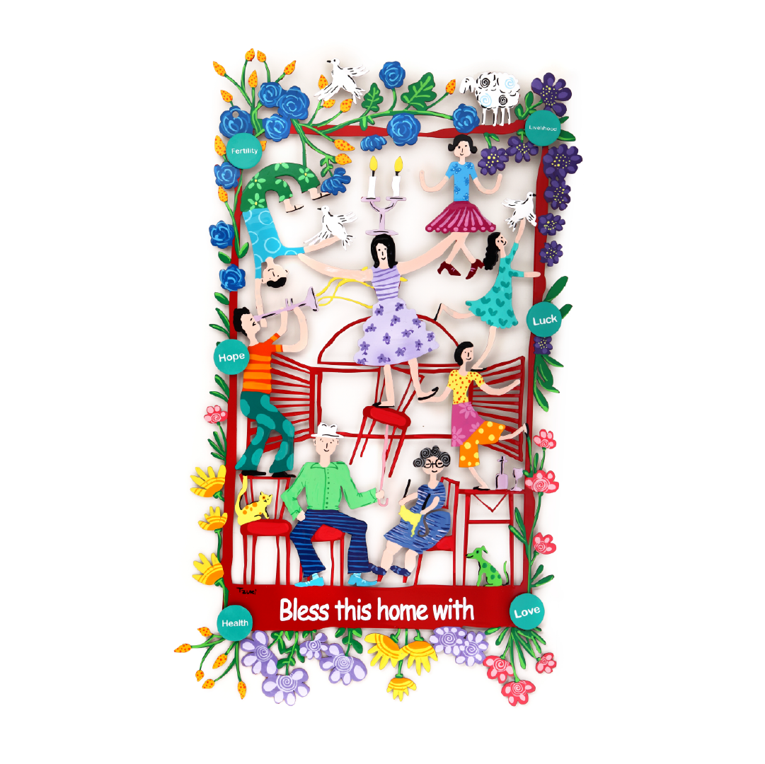 One image – a world of meaning. A colorful dream of a whole family, whole in heart and soul. All together, with joy in their eyes, hands reaching out, and little acts of love. The connections between the figures are not just lines – they are bonds, touch, closeness, and a promise. The home is blessed through these moments: of family friendship, hope, and endless laughter. When hands touch – hearts remain connected.