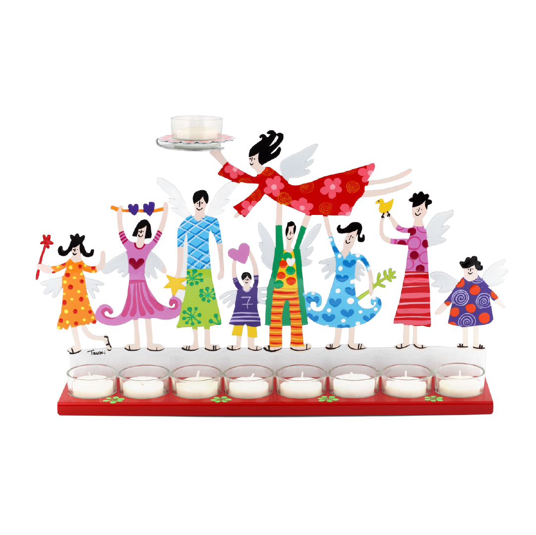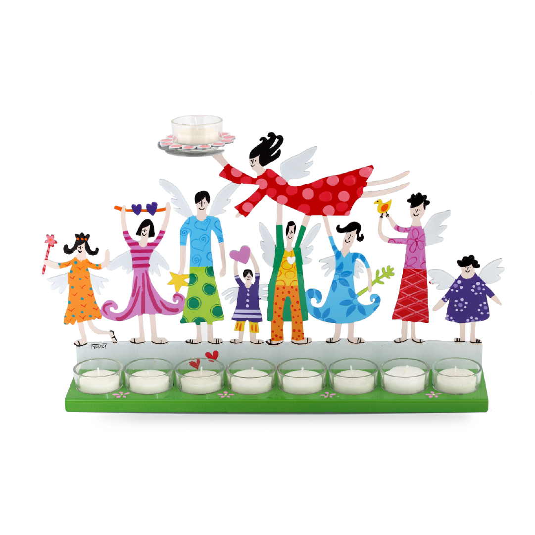 There are menorahs that light up a room – and then there are menorahs that light up the heart. “The Family” Hanukkiah is the very first menorah designed by Tzuki, and to this day, it remains a beloved and iconic piece in his collection. This joyful menorah celebrates the warmth, togetherness, and love that make a family. Each colorful figure – part angel, part human – is a character in a shared story: one holds hearts, one waves a star wand, another offers a bird of peace. Above them all, a winged figure flies gracefully with the shamash candle, as if carried by the strength of those who support her.